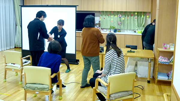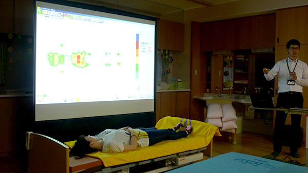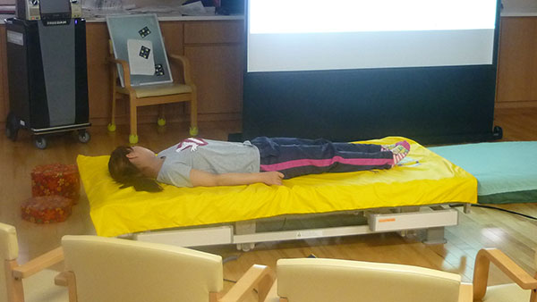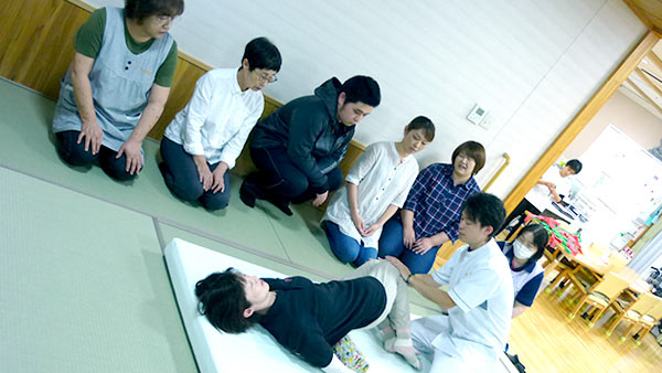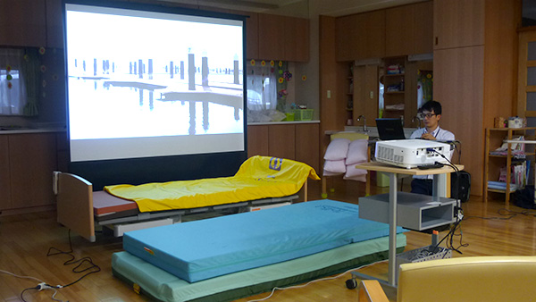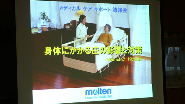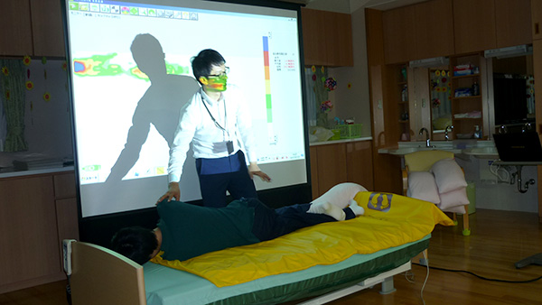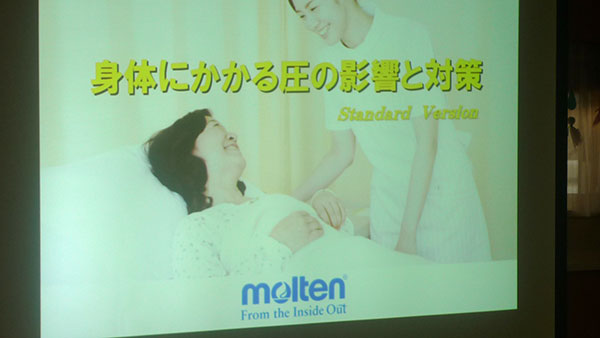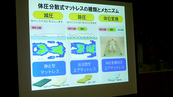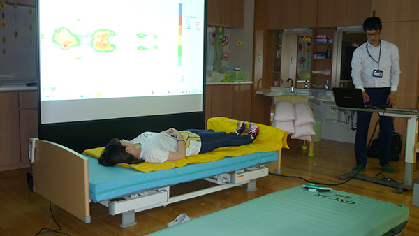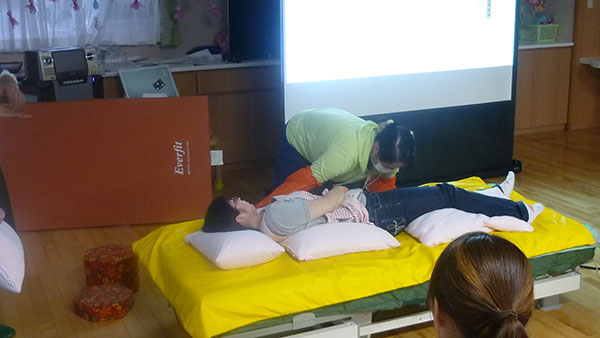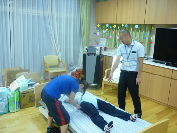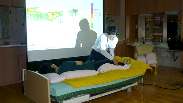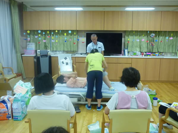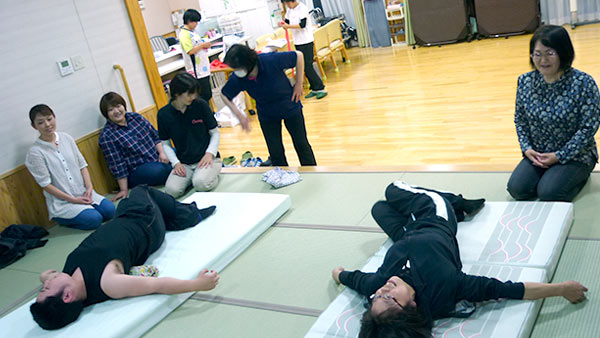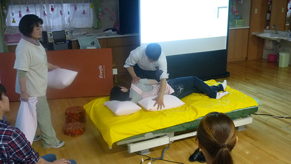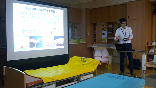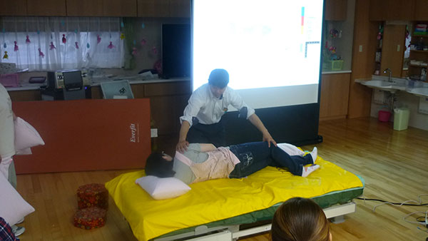 身体にかかる圧の影響と対策の研修会を開催しました。ベッドに寝ている時にかかる圧の影響とその対策方法をマットレスの使用、ポジショニングについて実際に体験しながら研修を行いました。今後に活かせるように積極的に参加し、話を聞いていました。