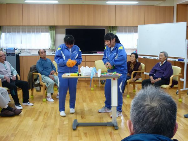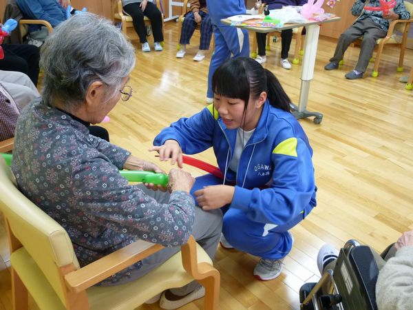 マイチャレンジで小川中学校の中学生2名が職場体験に参加しました。最初は慣れない表情でしたが、利用者のみなさんと一緒にバルーンアートを体験しているうちに笑顔がみられるようになりました。いつも以上に楽しい時間を過ごされていました。